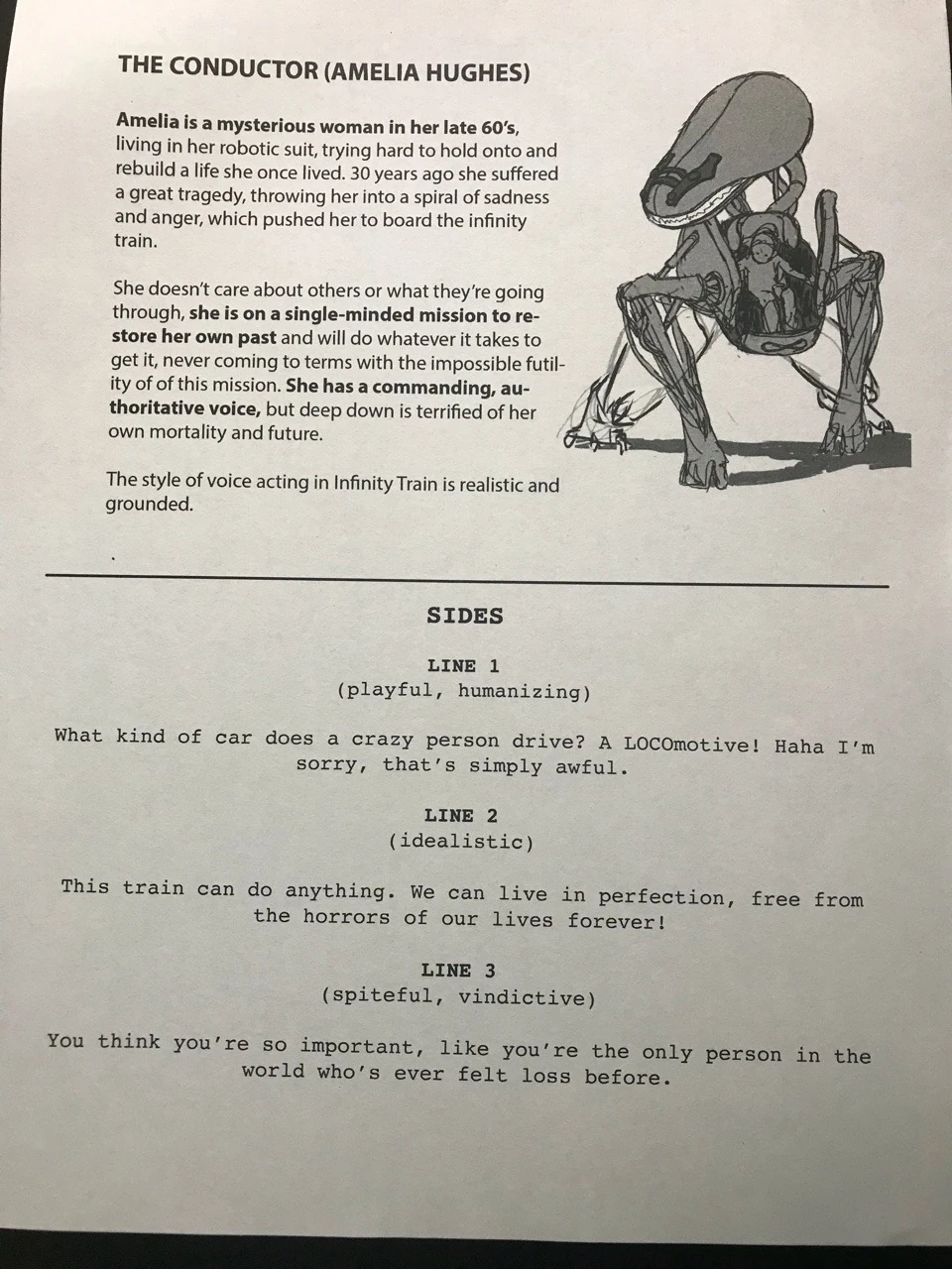 - At San Diego Comic-Con 2018, Cartoon Network hosted a voice acting seminar that included audition sides for Amelia, the Cat, and Randall for participants to read. The official description for Amelia was this: "Amelia is a mysterious woman in her late 60's, living in her robotic suit, trying hard to hold onto and rebuild a life she once lived. 30 years ago she suffered a great tragedy, throwing her into a spiral of sadness and anger, which pushed her to board the Infinity Train. She doesn't care about others or what they're going through, she is on a single-minded mission to restore her own past and will do whatever it takes to get it, never coming to terms with the impossible futility of this mission. She has a commanding authoritative voice, but deep down is terrified of her own morality and future."