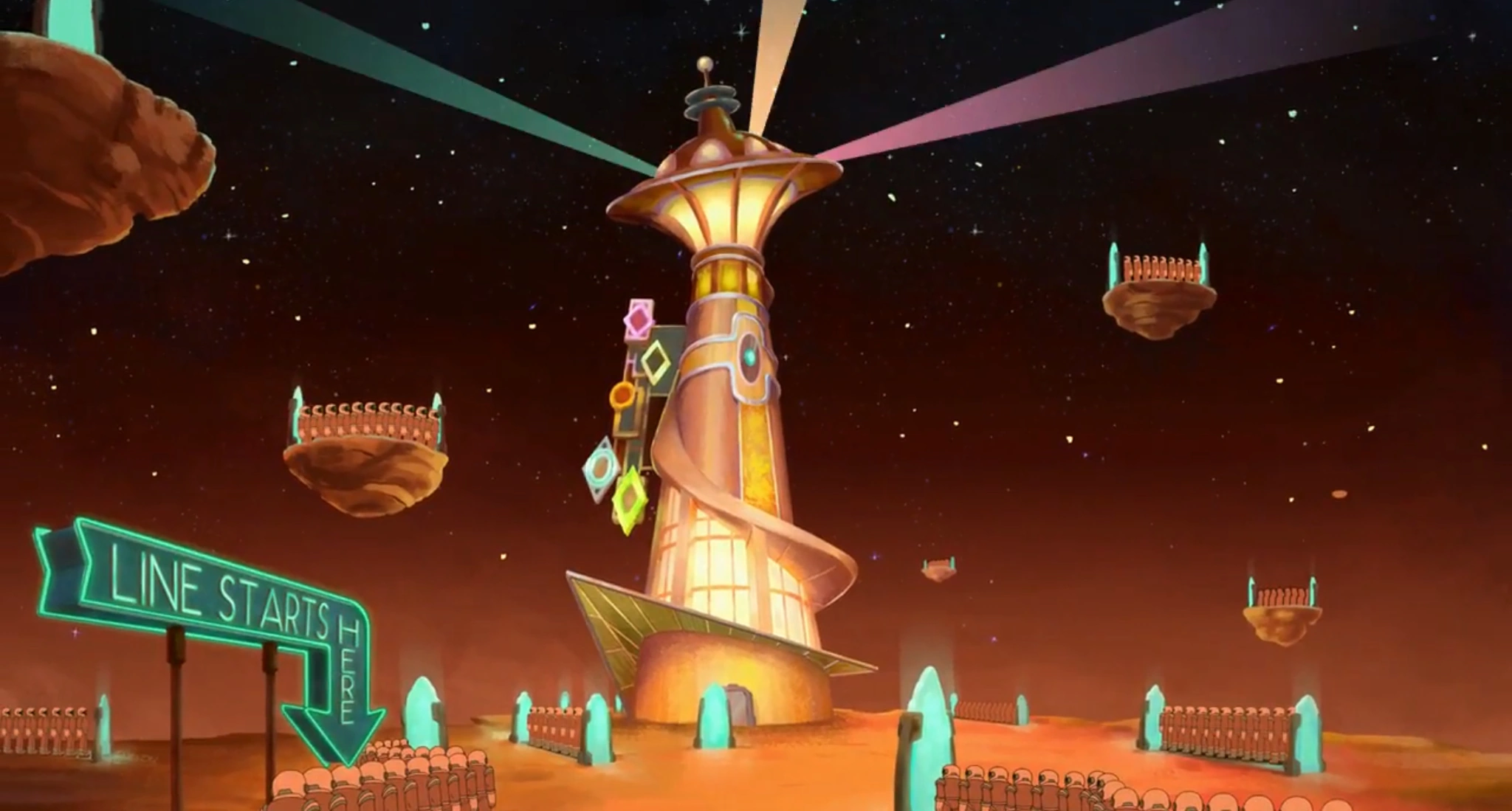The Astro Queue Car resembles a moon base with a club and various orange astronauts waiting in a line so long that it goes through portals. The bouncer, also a large astronaut, takes whomever is in front of the line and crushes them into a cube.