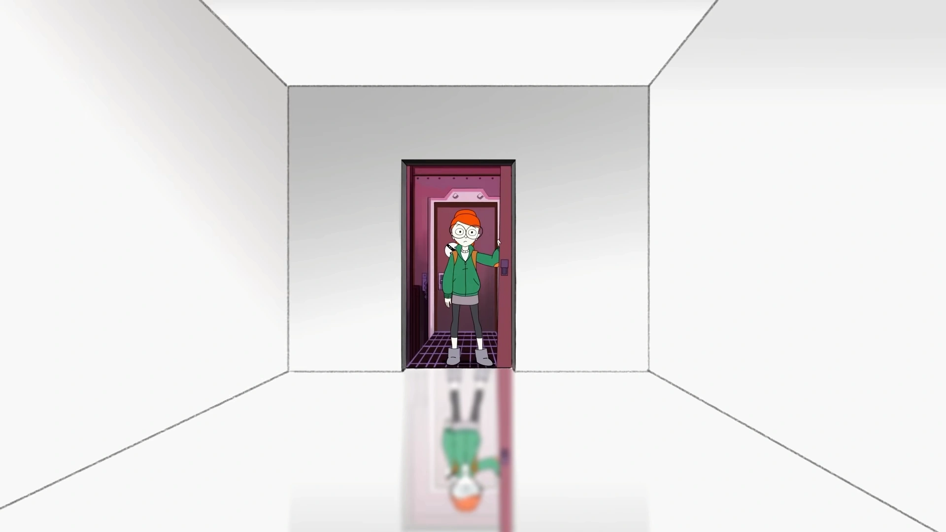 The inside of the car is a room with white walls, a white floor, and a white ceiling. The floor is shiny enough to show Tulip's reflection. This room is entirely empty, apart from farts that are seemingly created out of nowhere.