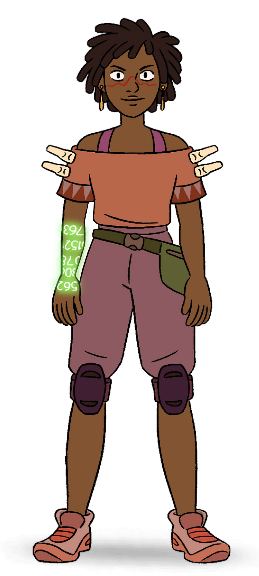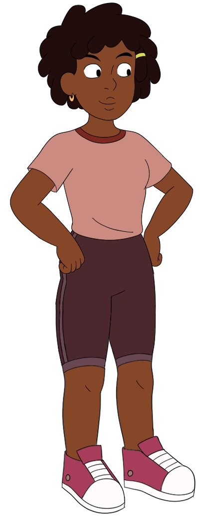 Her outfit consists a pale salmon top with a red and purple triangle pattern on the trim of the sleeves over a purple tank top. Clipped onto both of her shirt's sleeves are two shoplifting tags. She wears grayish purple shorts, gold earrings that resemble upside-down exclamation marks, a green fanny pack, purple knee-pads and pale red sneakers.
