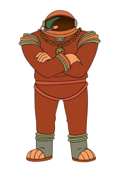 Like all denizens of the Astro Queue Car, Nigel is a living orange astronaut suit. However, he is bigger and wears a gold chain around his neck and a little orange lavalier microphone near his helmet.