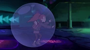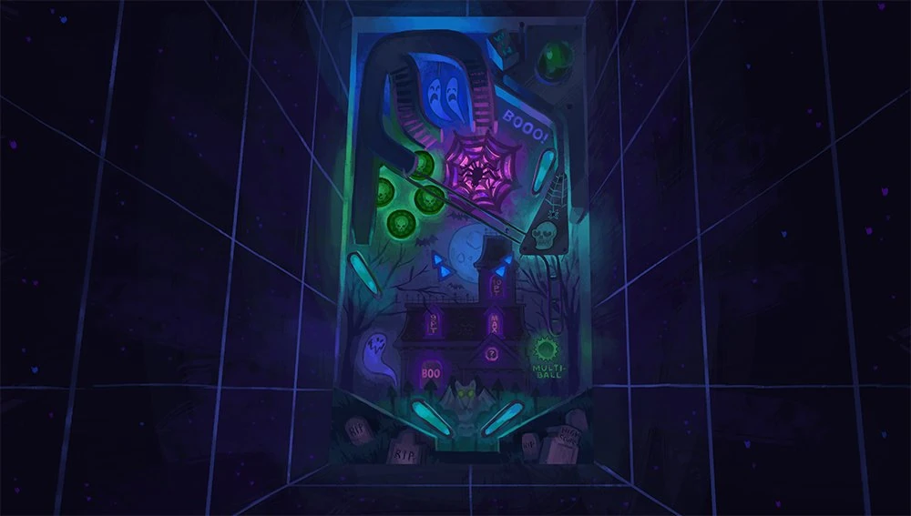 When looking at the train car from above, the environment looks similar to the inside of a giant pinball machine. The car is themed after a haunted house with drawings of ghosts, skull heads, bats, and spiders on the background. The flipper are blue and there's a multi-ball gutter to summon more balls in the game. It's unknown how a passenger has to get out of the car, but they have to get inside a pinball ball and rolls themselves around the car.