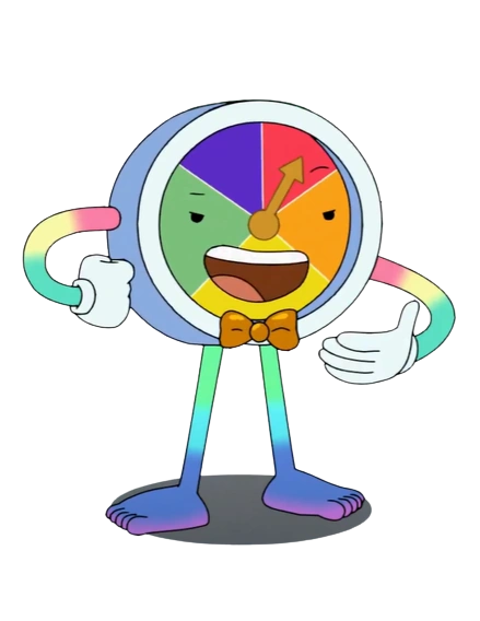 Roy's outer appearance matches the color his clock hand lands on. For instance, when the arrow lands on the color red, Roy's case, arms, gloves, legs, and feet also become red. The same applies for the other colors. Only the golden clock handle and white bow tie remain their constant color.