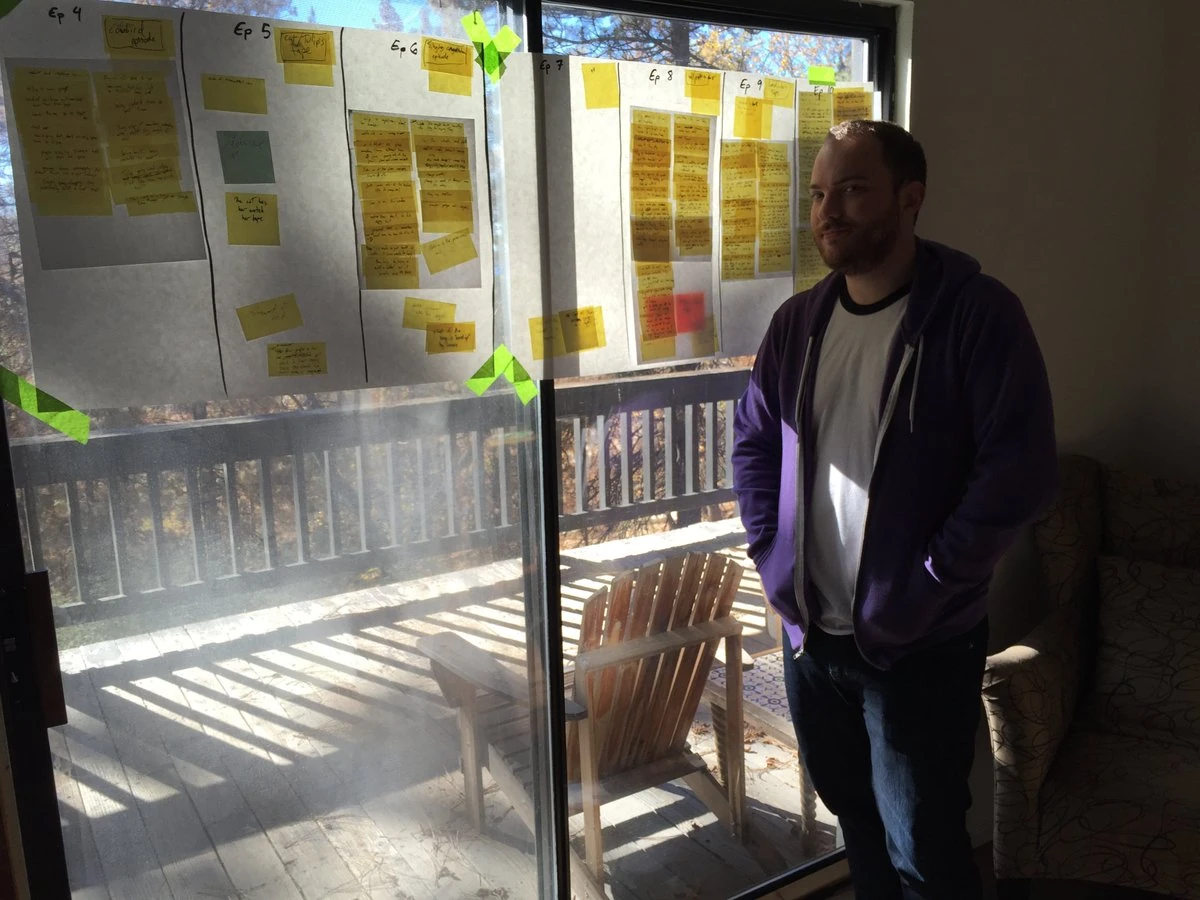 Owen Dennis stands in front of the beat board for the series.