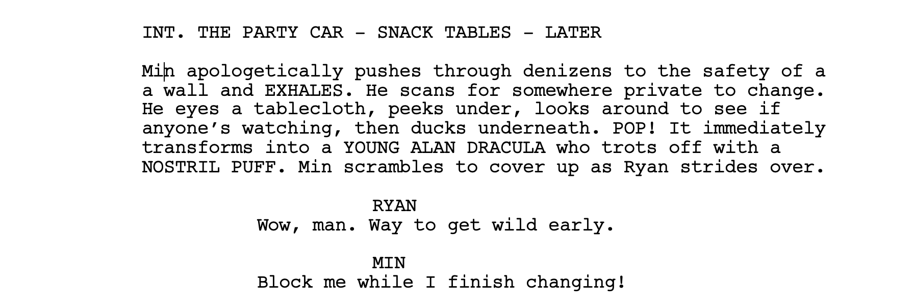 - Min-Gi tries to find a private place to change his clothes while Ryan joins the party. When Min-Gi tries changing under a table it immediately reveals to be a younger Alan Dracula during transformation. The deer leaves Min-Gi awkwardly undressed. This scene was suppose to follow Ryan's line "Haha, yeah maybe this time you can actually play with me". It was cut for time, although Min-Gi still expresses outrage after it is revealed the club had a bathroom the entire time.
